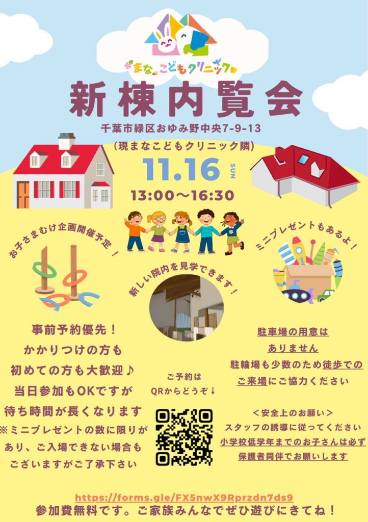 11月16日(日)午後に、新しい「まなこどもクリニック」の内覧会を開催します。詳細はチラシをご参照ください。