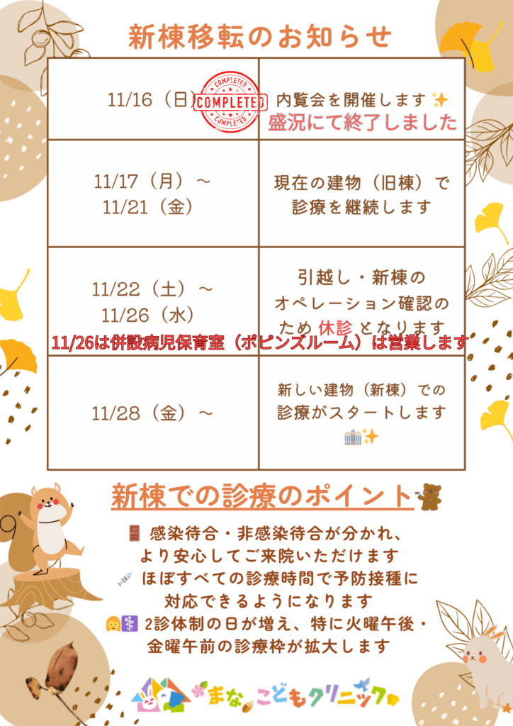 当院の方針をご理解いただき心より御礼申し上げます。このおゆみ野の地域の子育て支援の一端を担えるよう、今後も邁進していきたいと思います。新棟移転に伴い、しばらくは皆様にご迷惑をおかけするかと存じますが、何卒ご容赦いただければと思います。ご来院の際は、以下のスケジュール2枚をご確認ください。