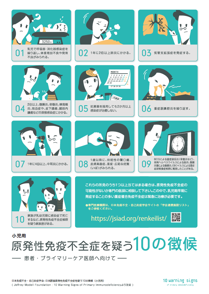 「免疫不全症データベース」というホームページがあり、保護者の方向けにも情報公開されているので、ご心配な方は一度参照してみてください。特に「原発性免疫不全症を疑う10の徴候」は参考になります。
